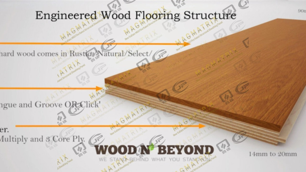 تعرضت طبقات متعددة معا في نمط من الحبوب الخشبية المصممة ، مما يحسن الاستقرار الأبعاد. يحتوي الهيكل على طبقة قشرة خشبية حقيقية (سمك 2-5 مم) متصلة بعدة طبقات من الخشب الرقائقي. هذا البناء الفريد يخلق منتجًا أقوى وأكثر صلابة من الخشب الصلب. معظم المنتجات تأتي مع حواف اللسان والأخدود. يستخدم العديد من الشركات المصنعة الآن أنظمة قفل النقر لتسهيل التثبيت.